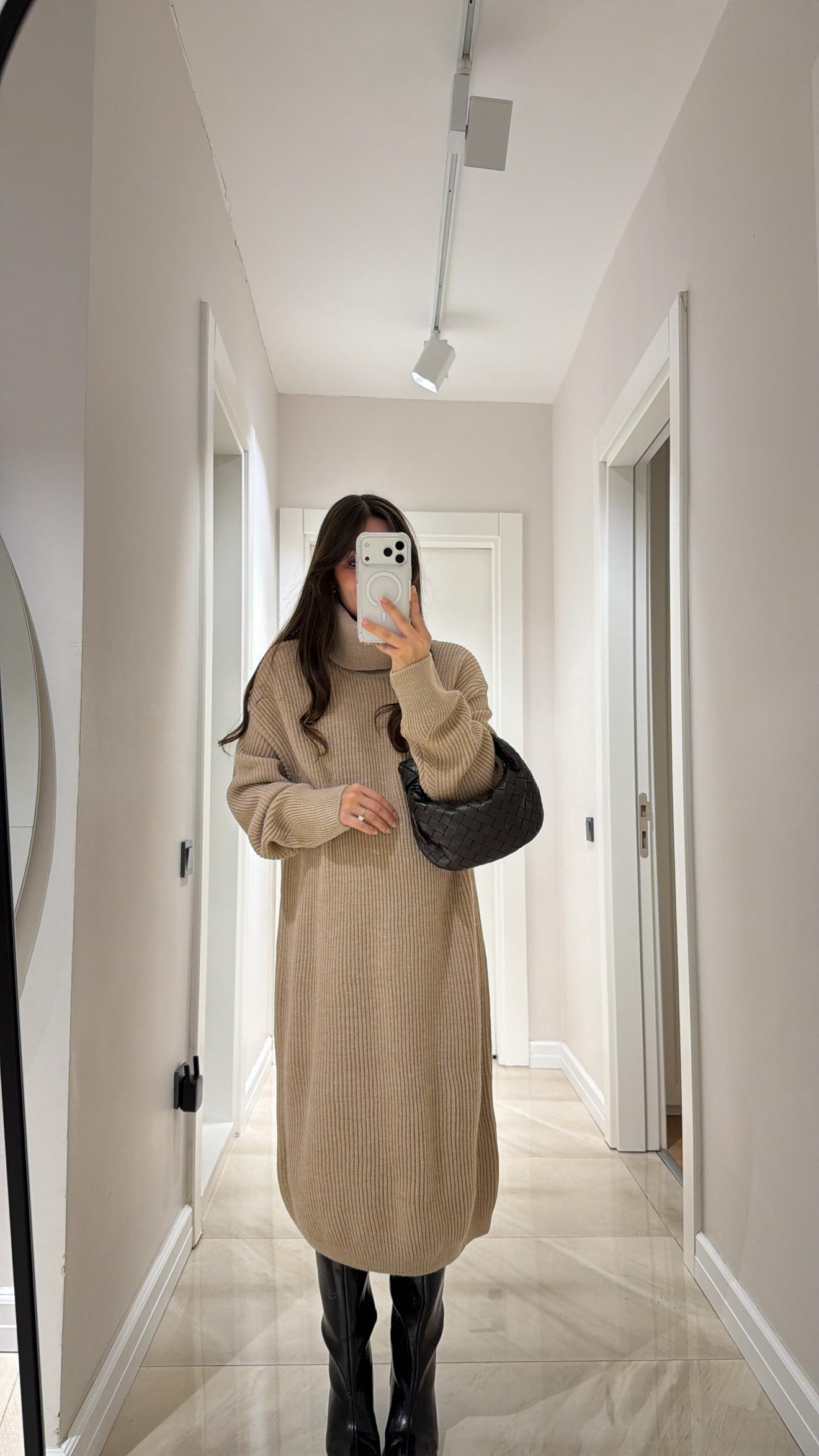 Bej Balıkçı Yaka Fitilli Marka Model Triko Elbise (Belb535)