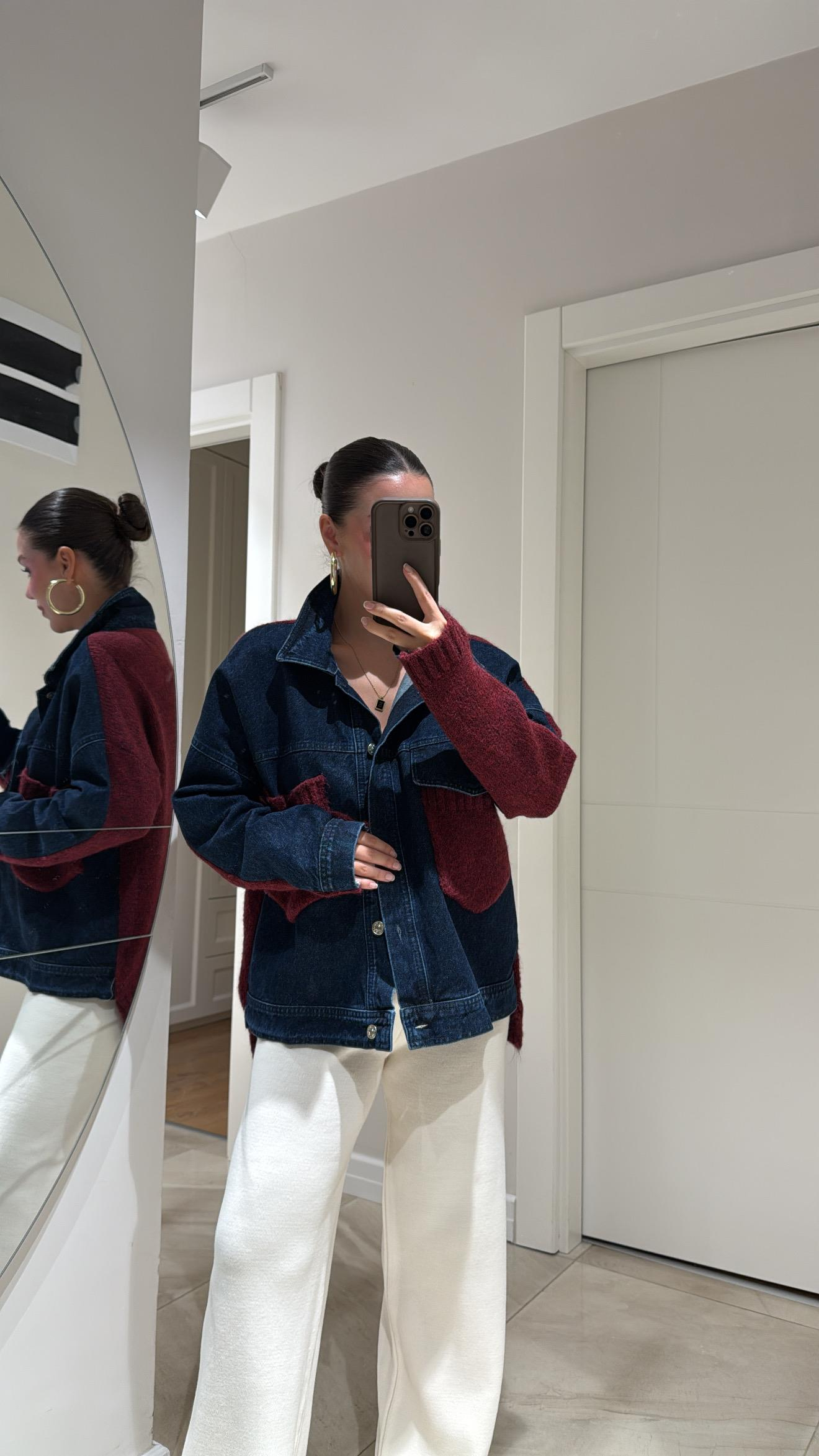 Bordo Denim Detaylı Ön Cepli Triko Ceket