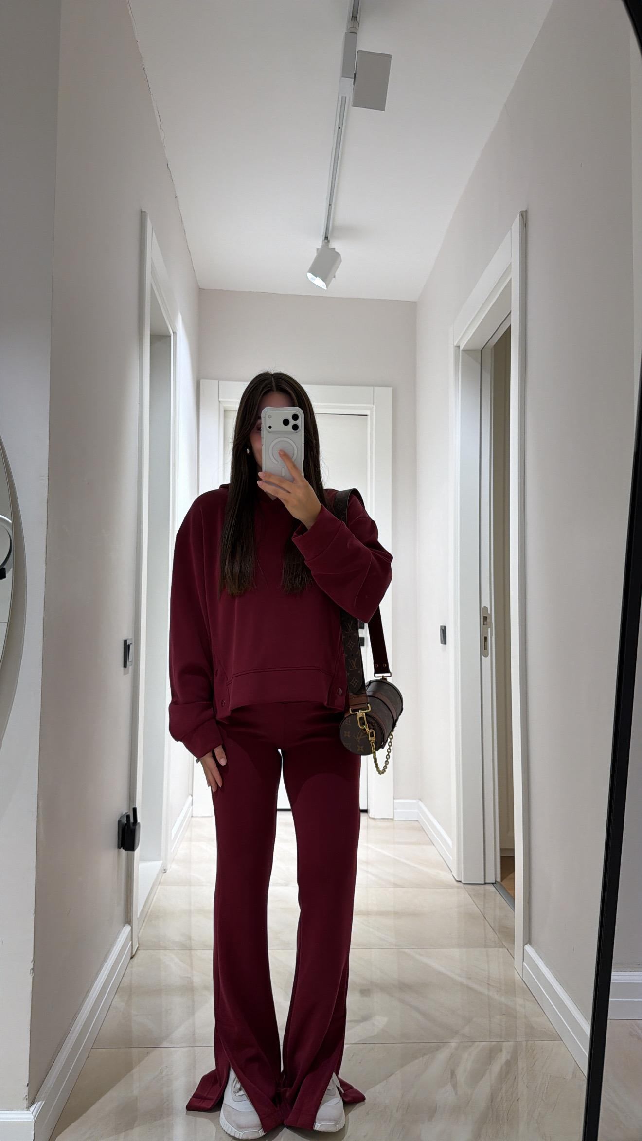 Bordo Yırtmaç Detaylı Kapüşonlu Modal Takım