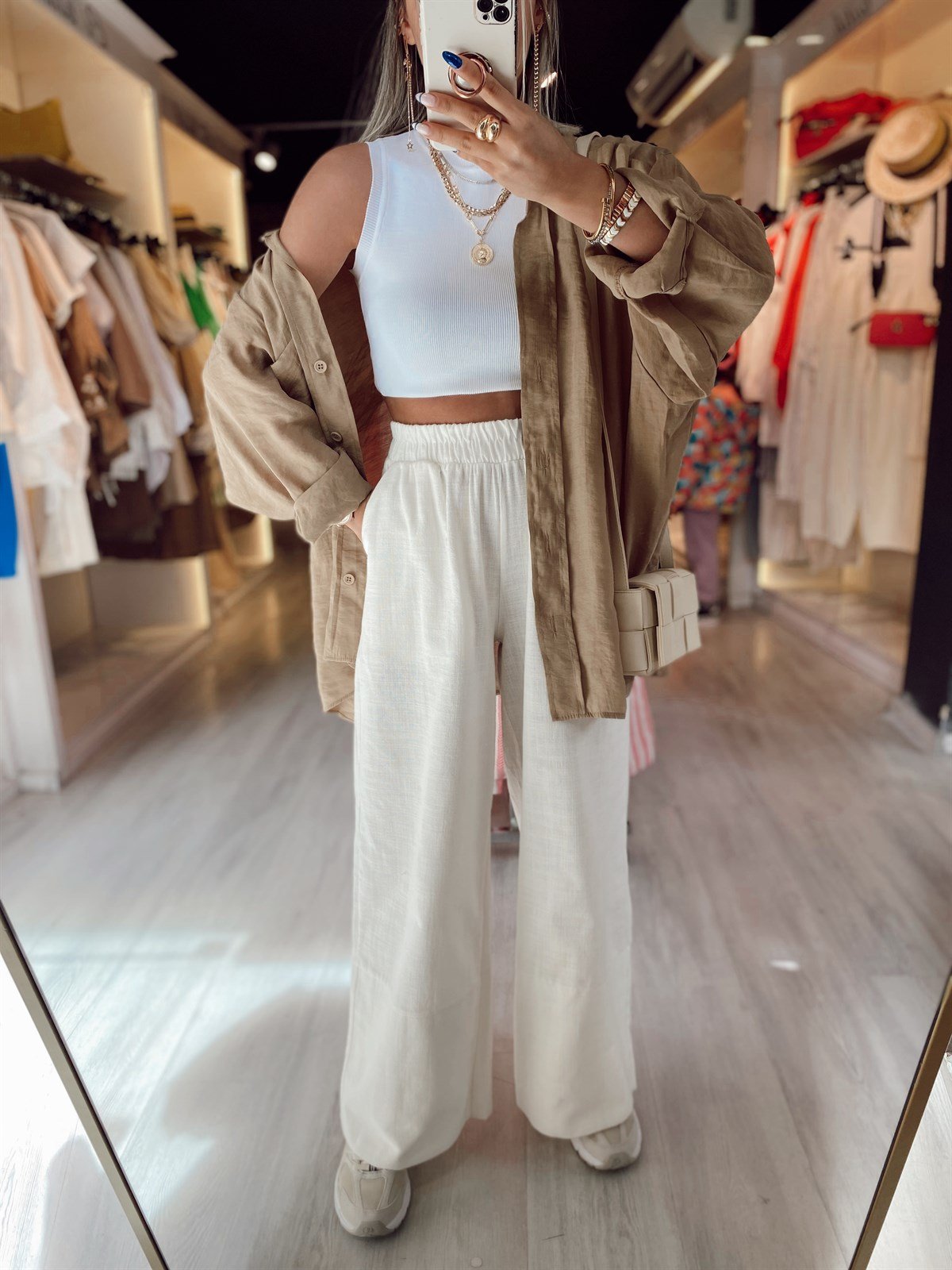 Ekru Geniş Paça Keten Pantolon