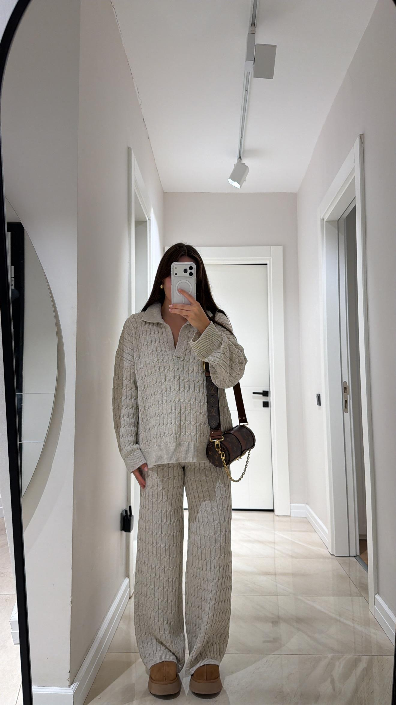 Bej V Yaka Saç Örgülü Triko Takım (Btkm998)