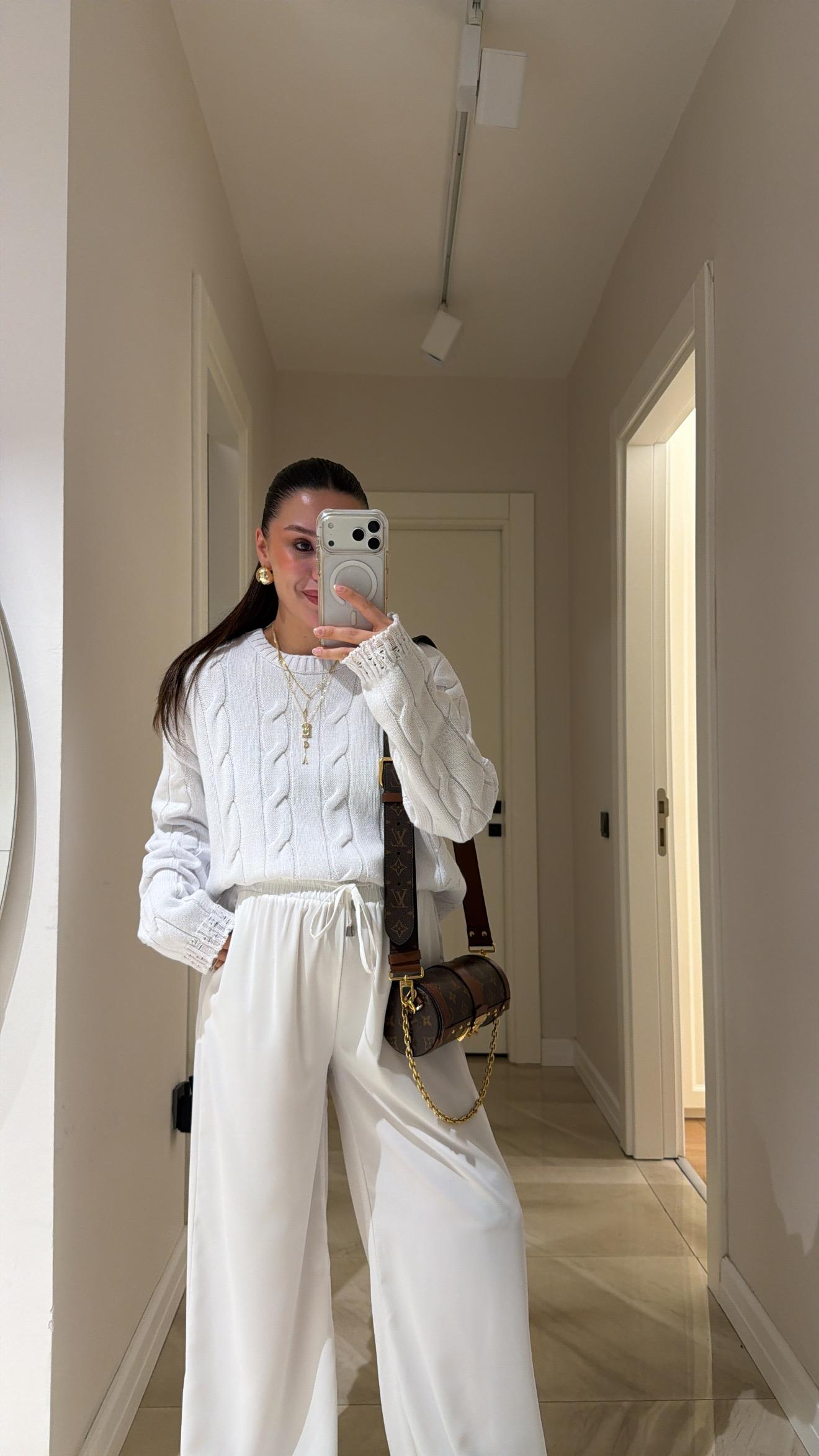 Beyaz Bel Lastikli Saten Bol Pantolon