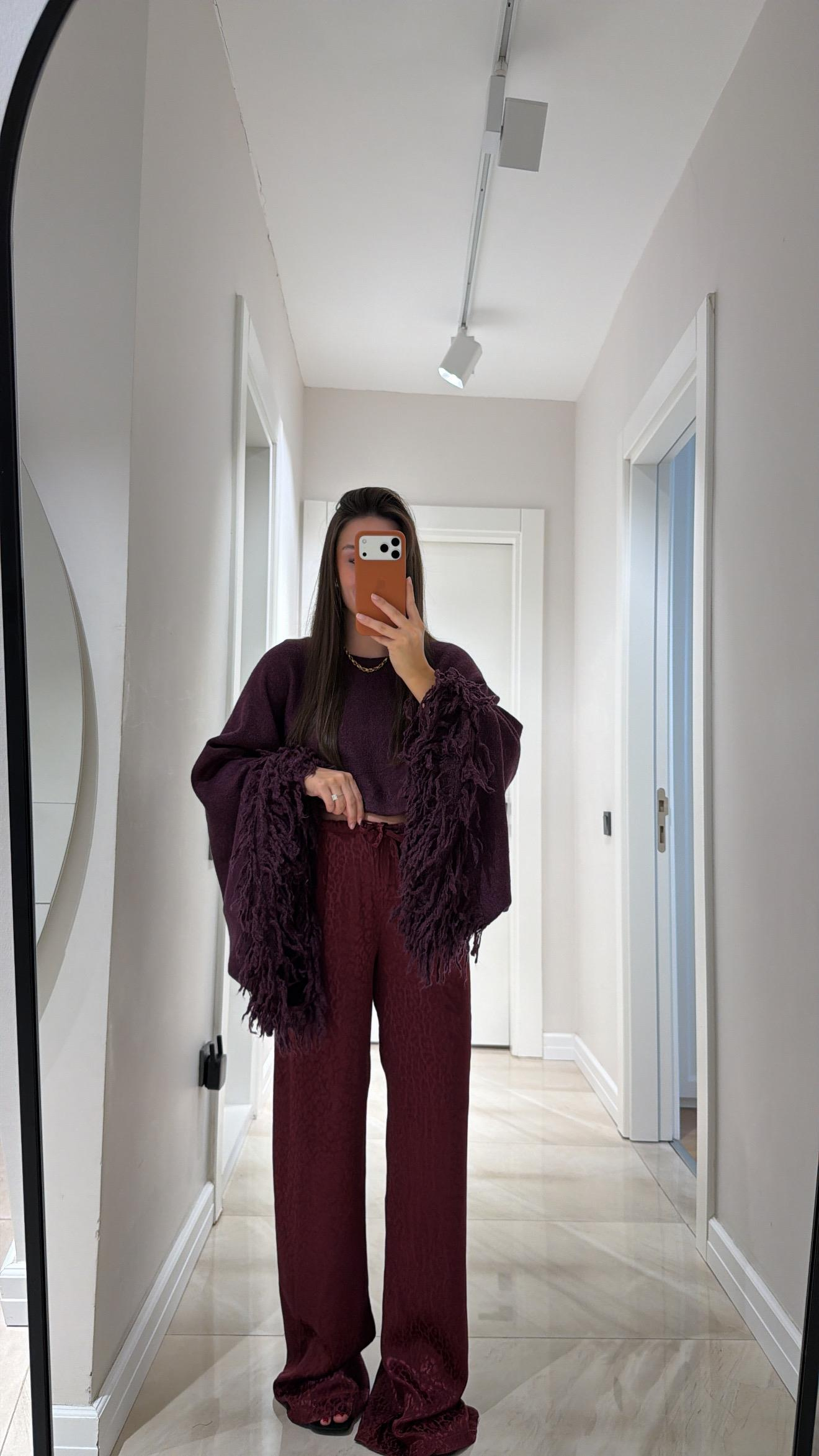 Bordo Leopar Desenli Jakarlı Bol Paça Pantolon (Bpan1404)