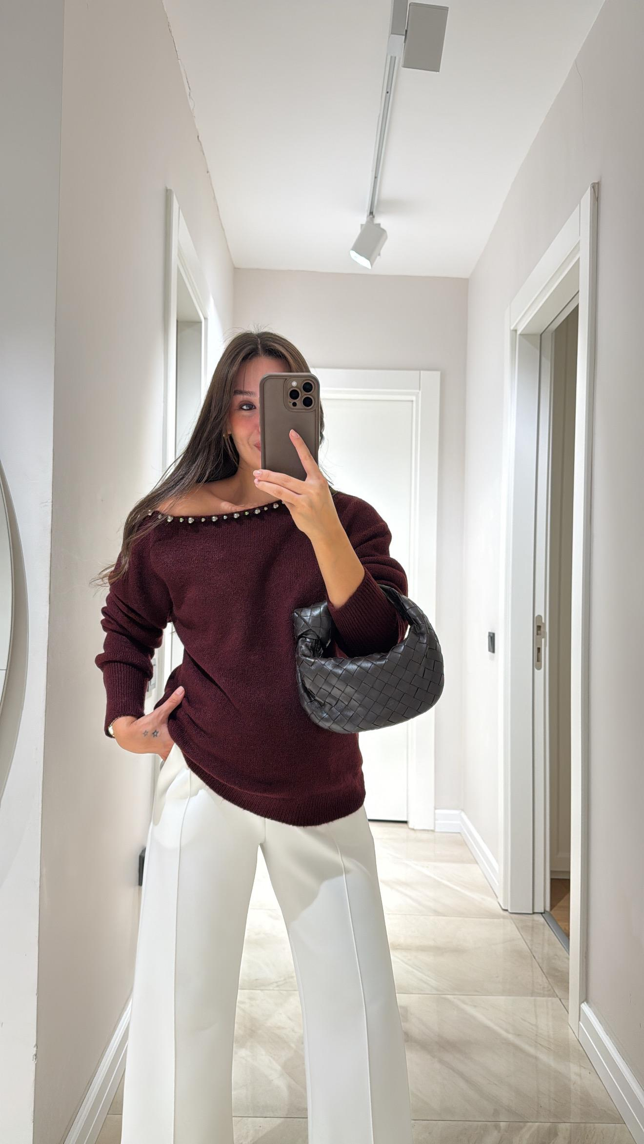 Bordo Yaka İncili Triko Kazak (Bkzk768)