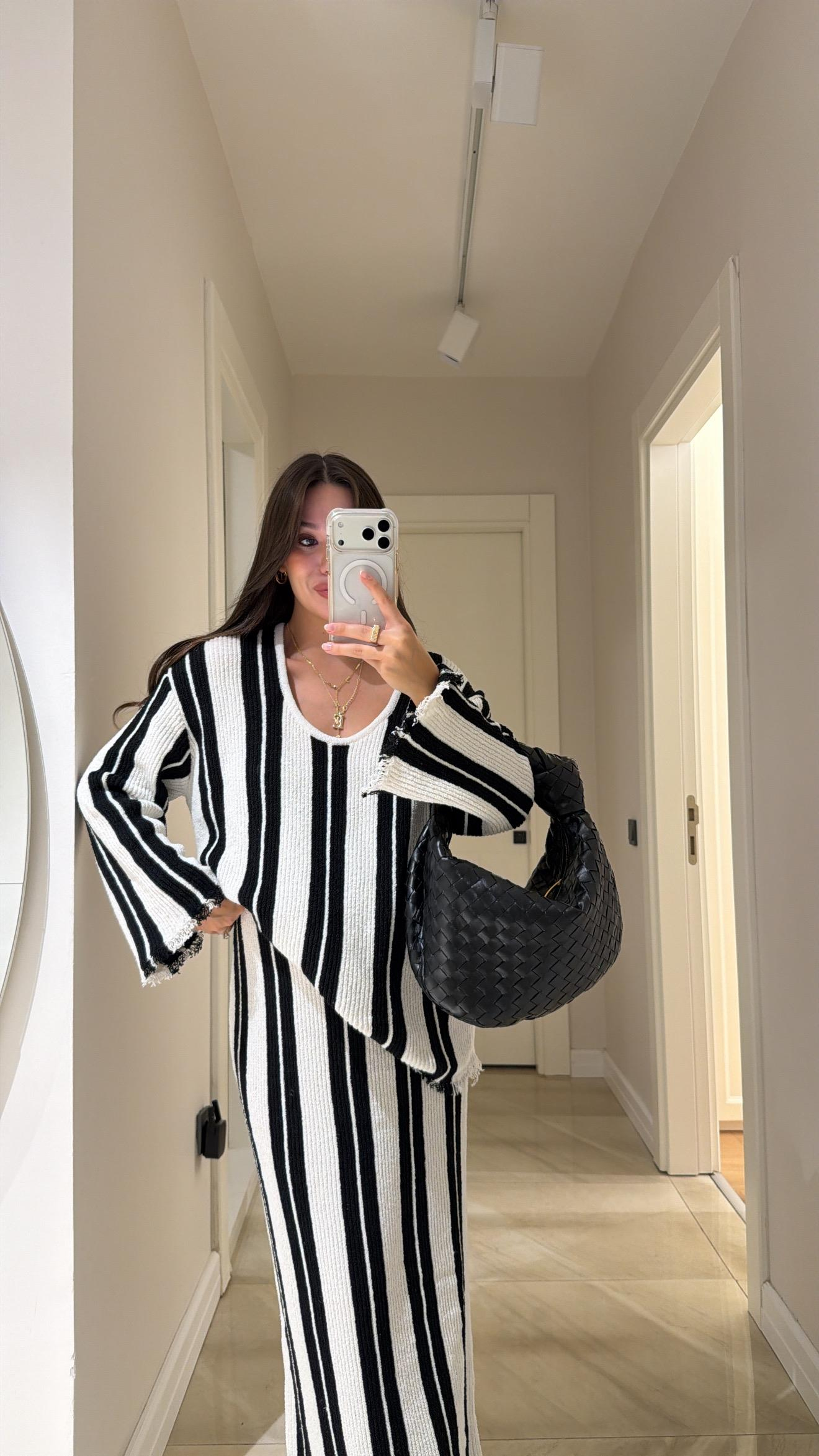 Ekru Siyah Dik Çizgili Yırtık Detaylı Marka Model Kazak