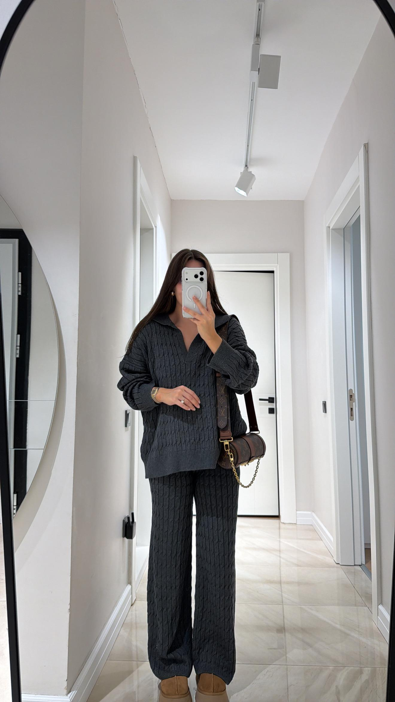 Gri V Yaka Saç Örgülü Triko Takım (Btkm997)