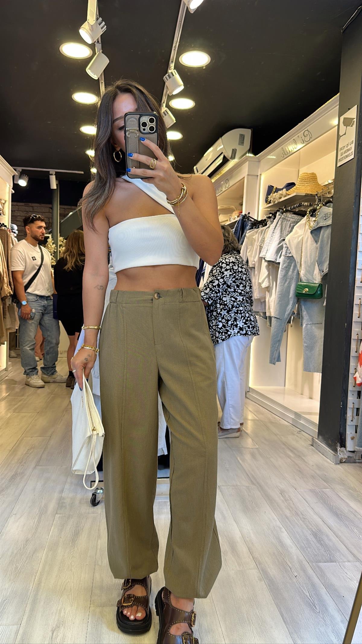 Haki Beli Lastikli Paça Büzgülü Keten Pantolon