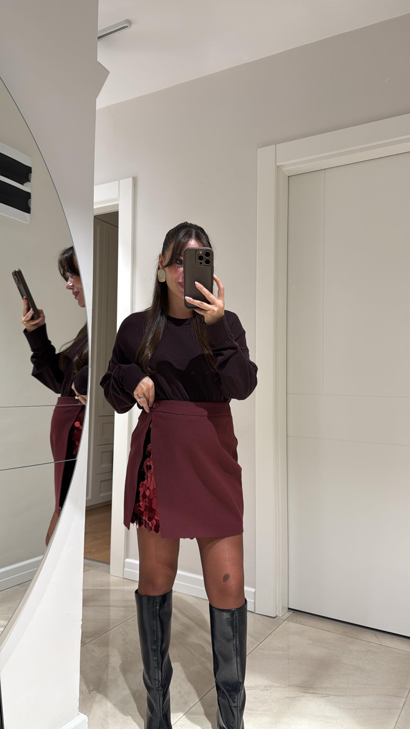 Bordo Payet Detaylı Mini Etek Gold Kare Silver Küpe
