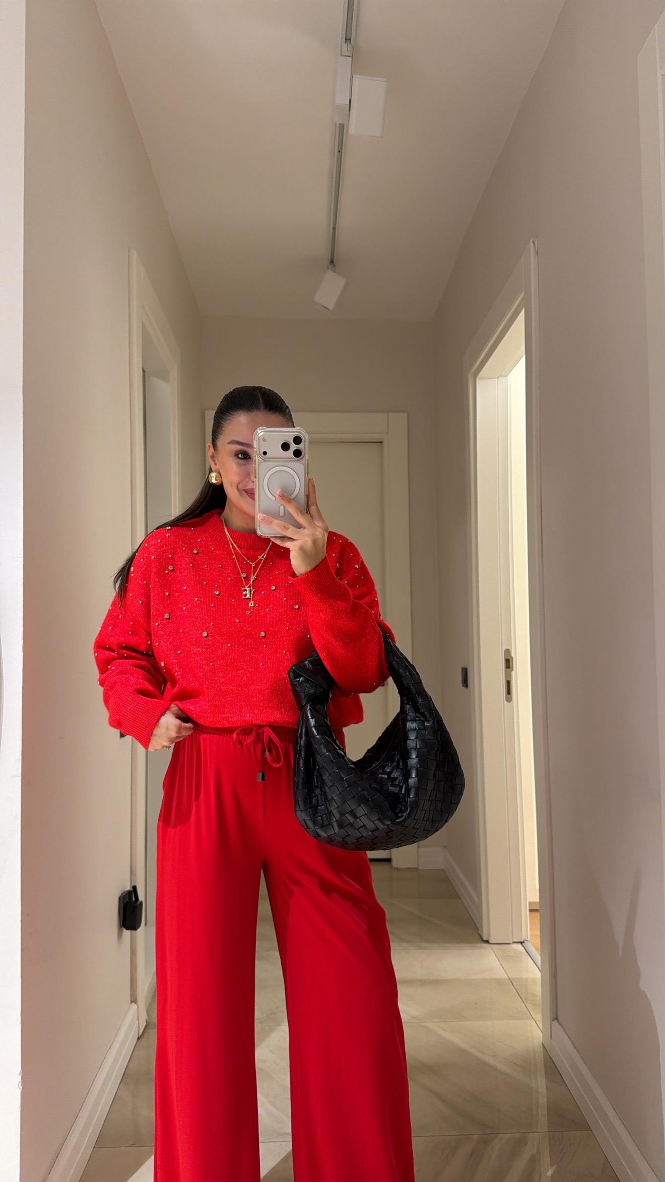 Kırmızı Dağınık Taşlı Triko Kazak (Bkzk891)