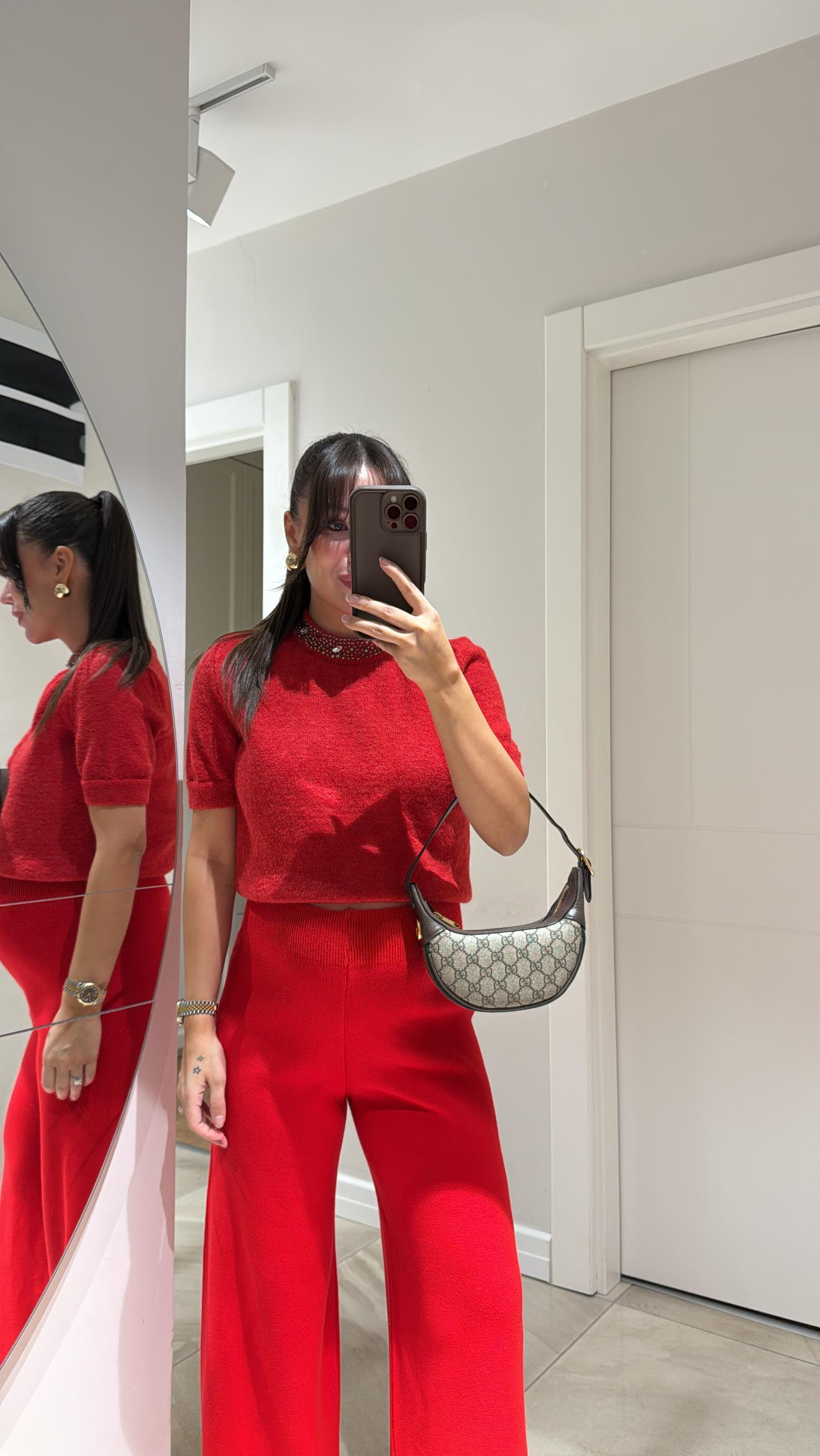Kırmızı Yaka Taş Detaylı Marka Model Triko Kazak