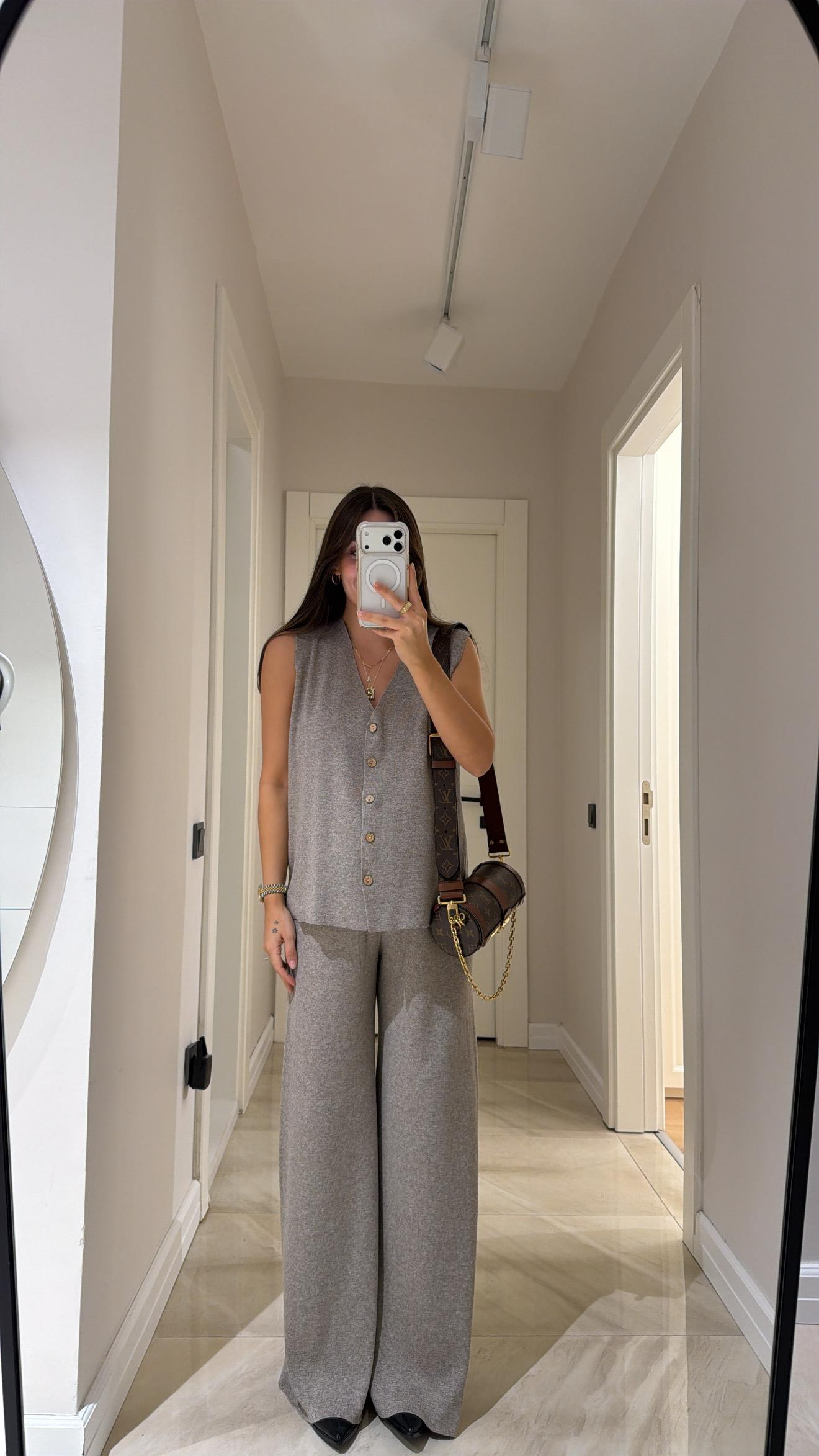 Koyu Bej V Yaka Ön Düğmeli Triko Yelek Takım