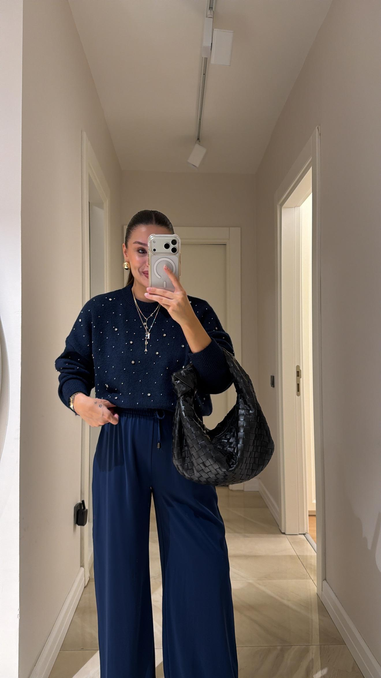 Lacivert Bol Paça Tensel Pantolon Gold Asimetrik Harfli Kolye