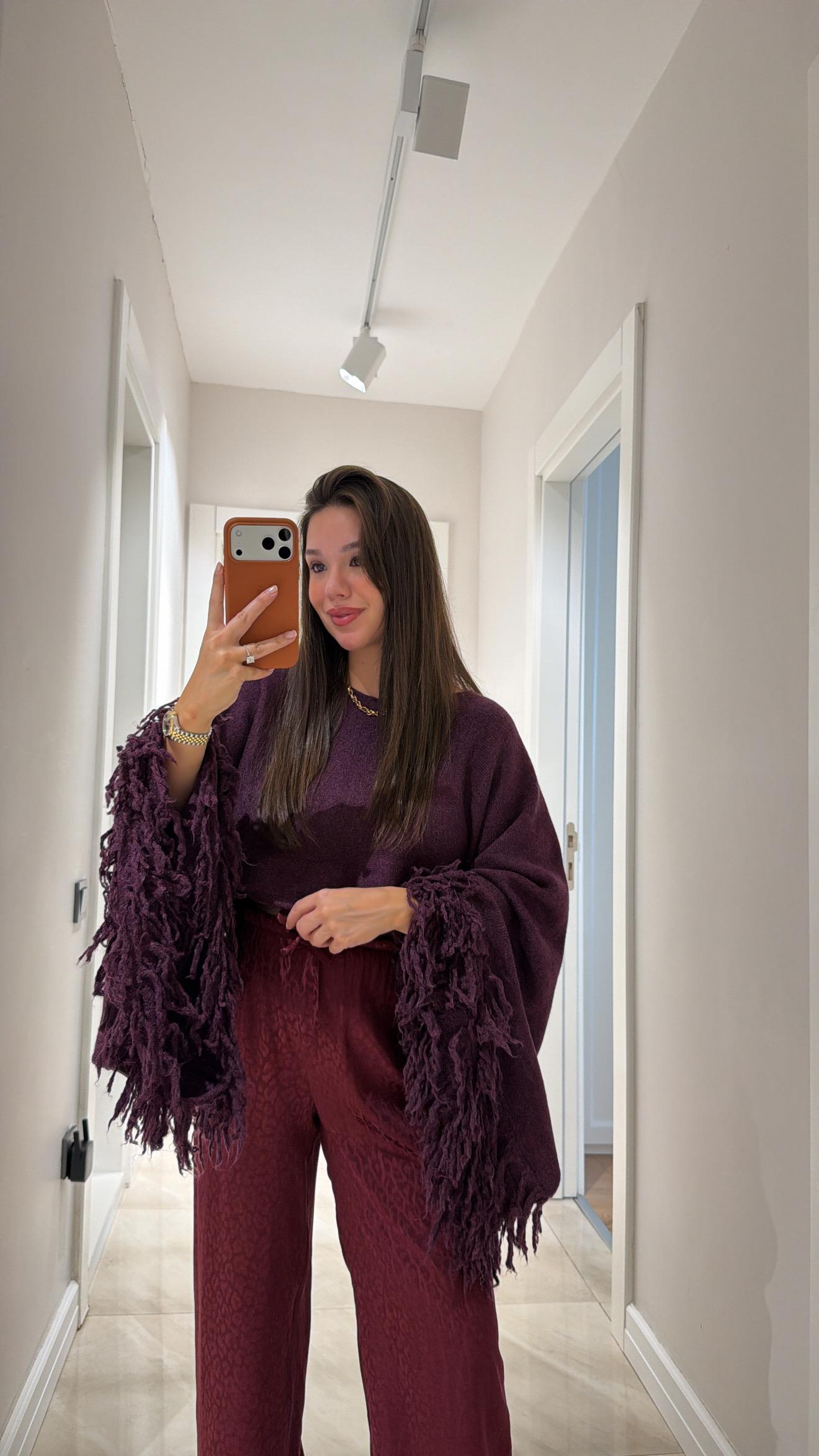 Mürdüm Kol Püsküllü Triko Kazak (Bkzk832)