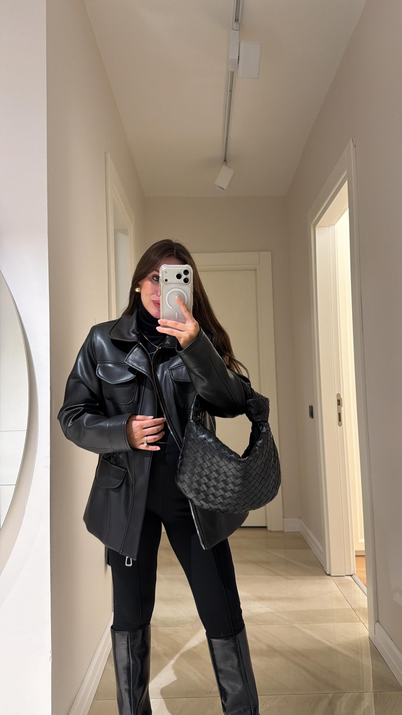 Siyah Balıkçı Yaka Basic Bluz Siyah Ön Dikiş Detaylı Lastikli Ravi Tayt Gold Asimetrik Harfli Kolye