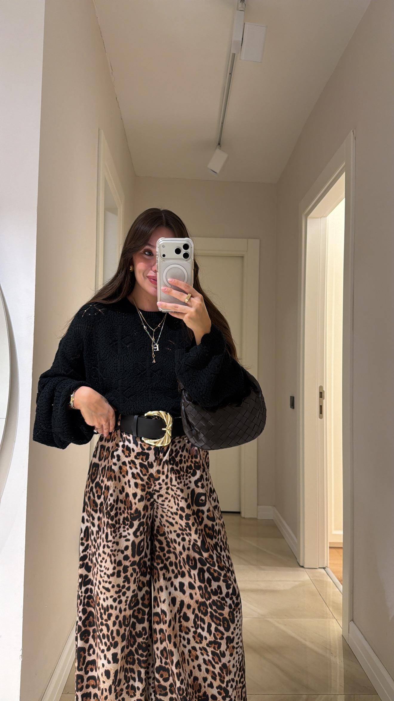 Krem Siyah Leopar Desen Kemerli Palazzo Pantolon Gold Asimetrik Harfli Kolye