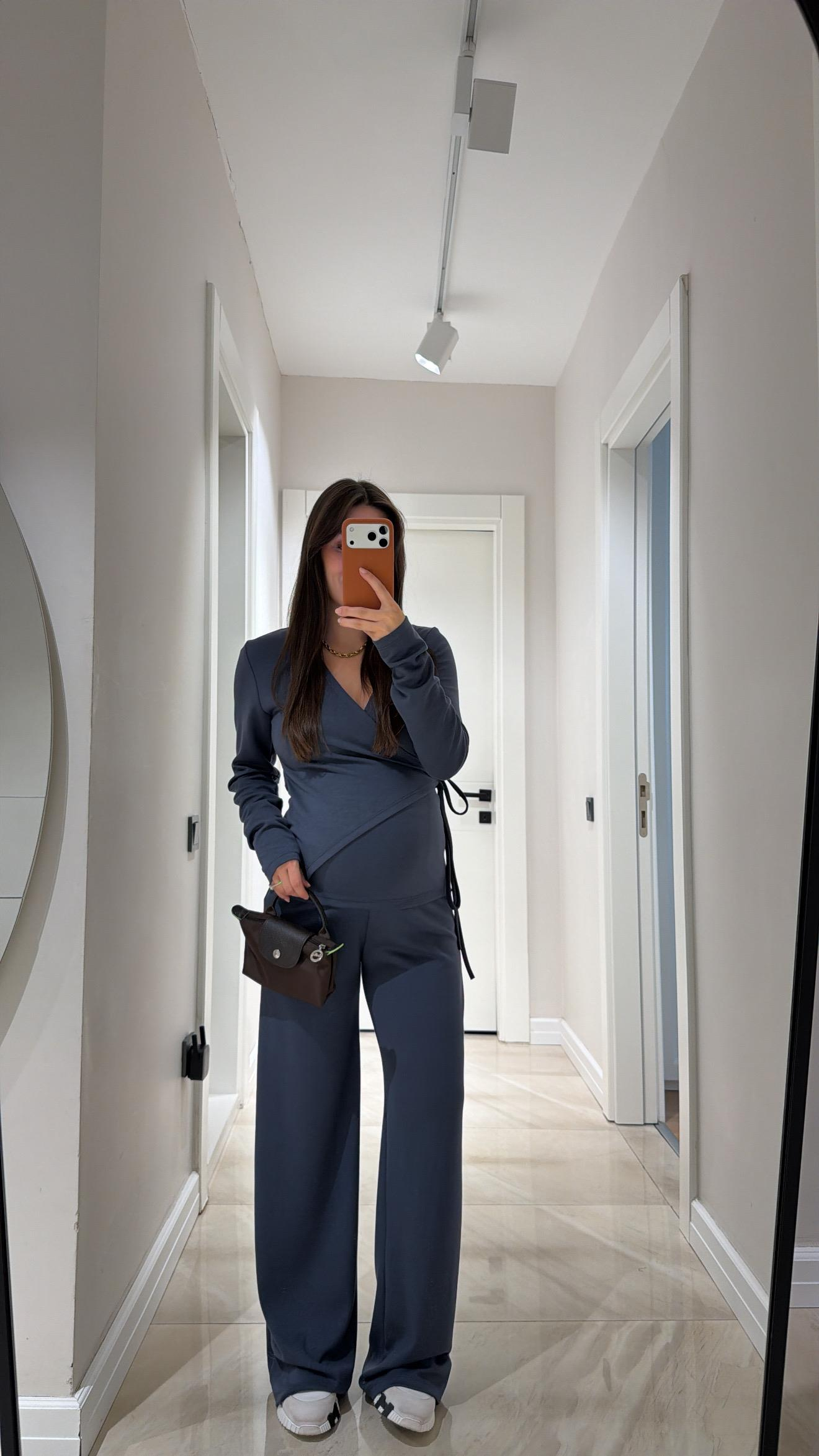 Boy 160 cm Üst : Kruvaze Yaka , Uzun Kol , Bağlama Detaylı  / Alt : Bel Lastikli , Cepli , Geniş Paça