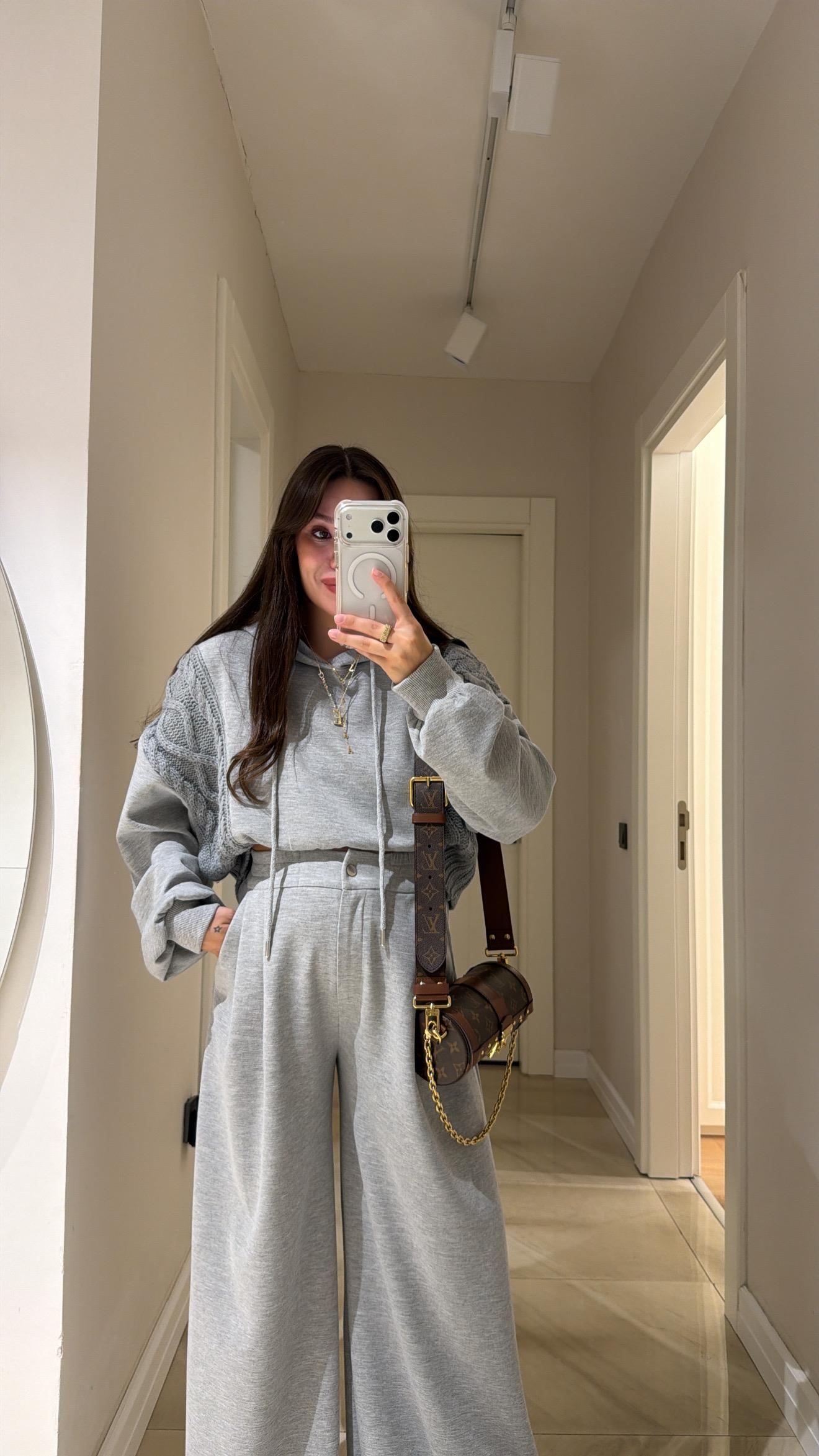 Gri Triko Detaylı Kapüşonlu Sweatshirt