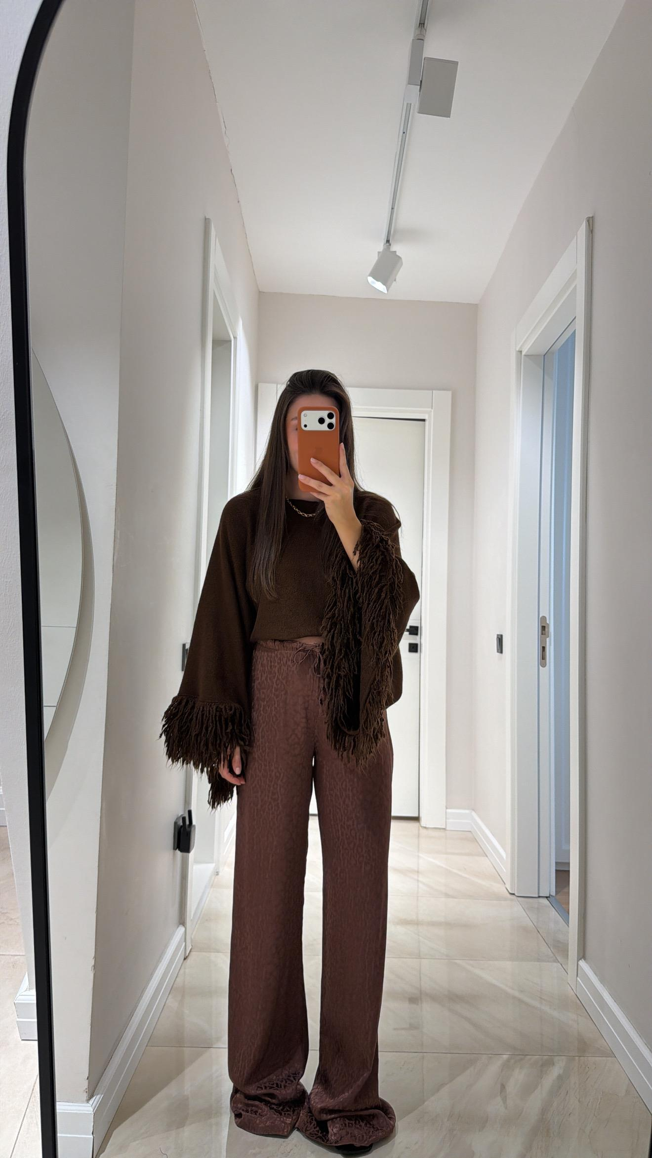 Kahve Leopar Desenli Jakarlı Bol Paça Pantolon