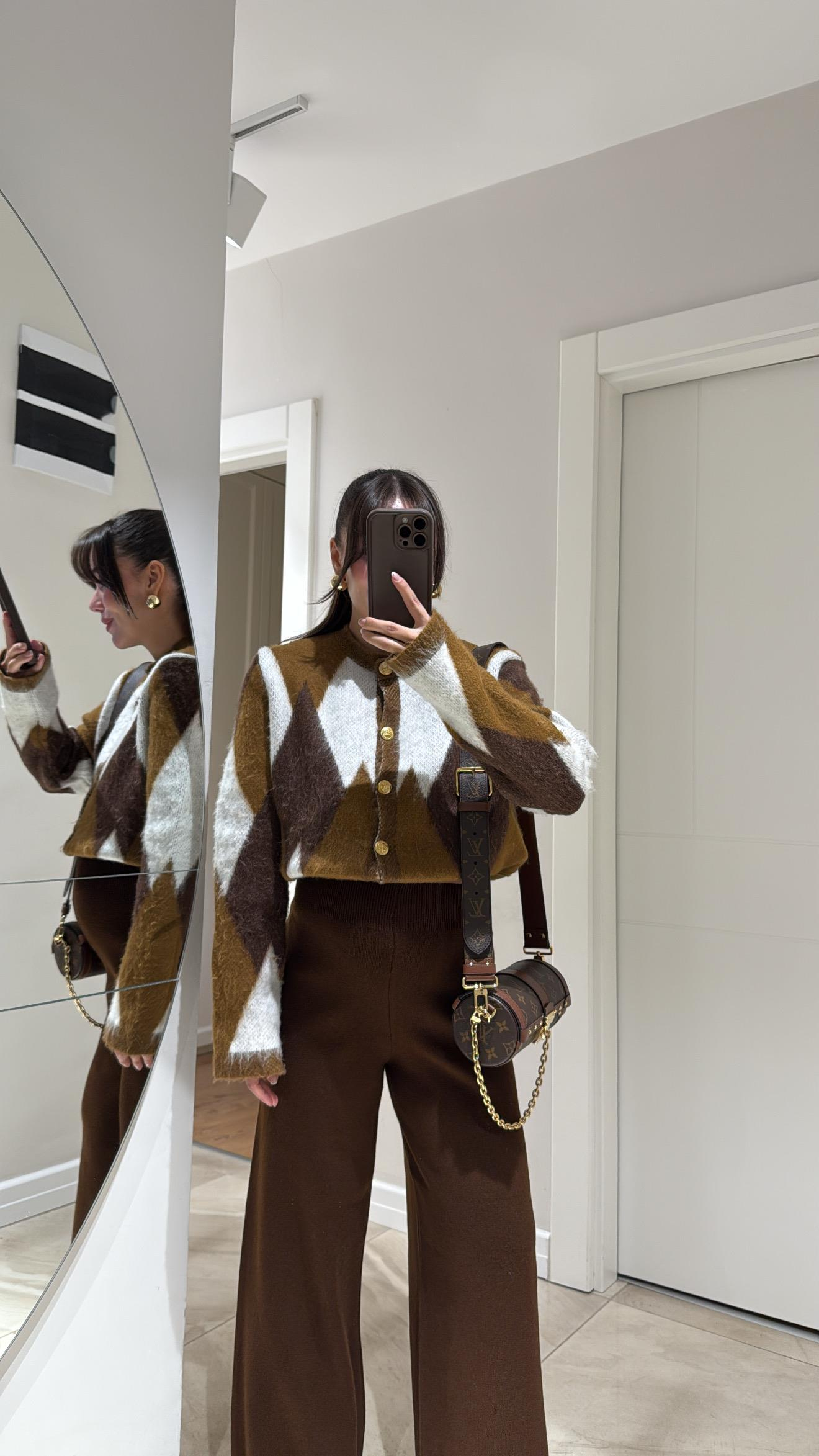 Karamel Kemik Baklava Desen Düğmeli Sakallı Hırka