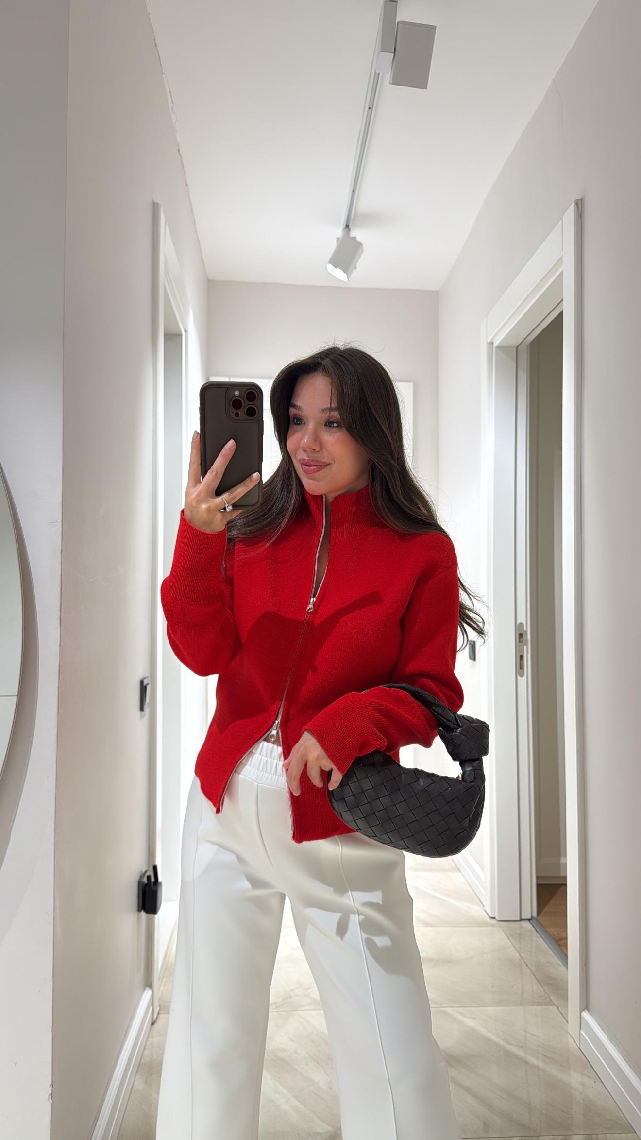 Kırmızı Çift Fermuarlı Örme Hırka