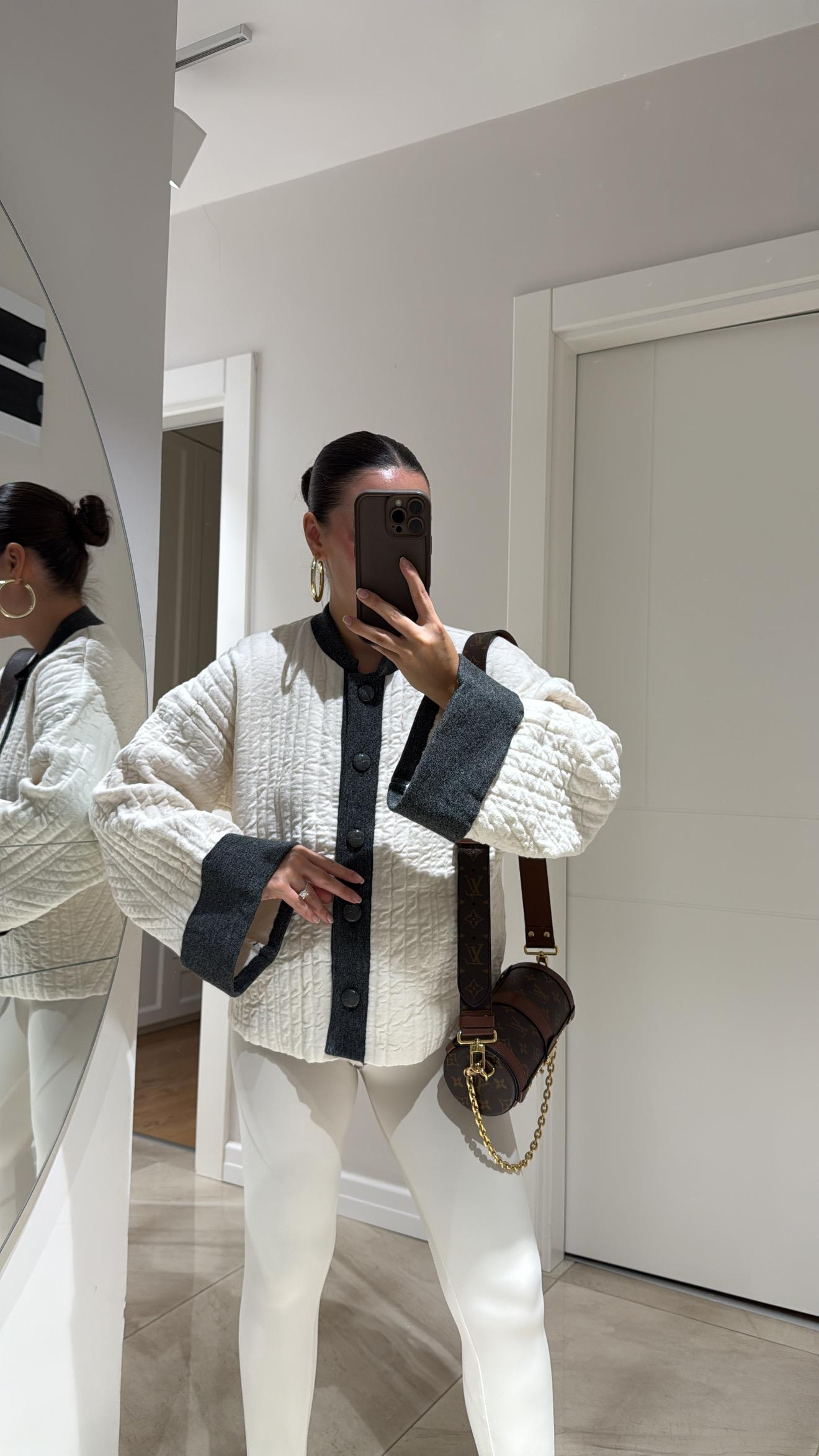 Krem Antrasit Kendinden Desenli Düğmeli Hırka