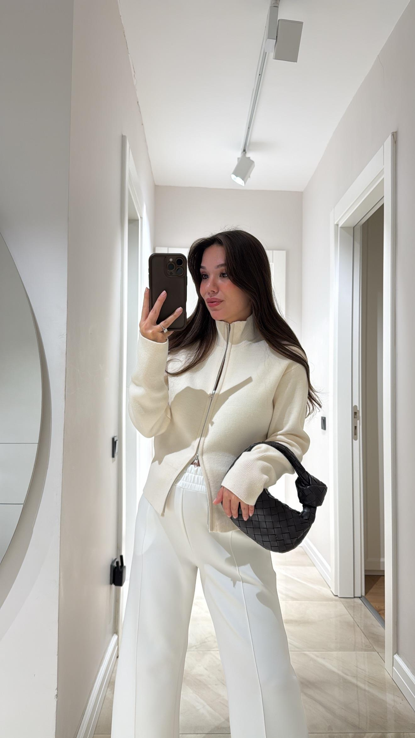Krem Çift Fermuarlı Örme Hırka