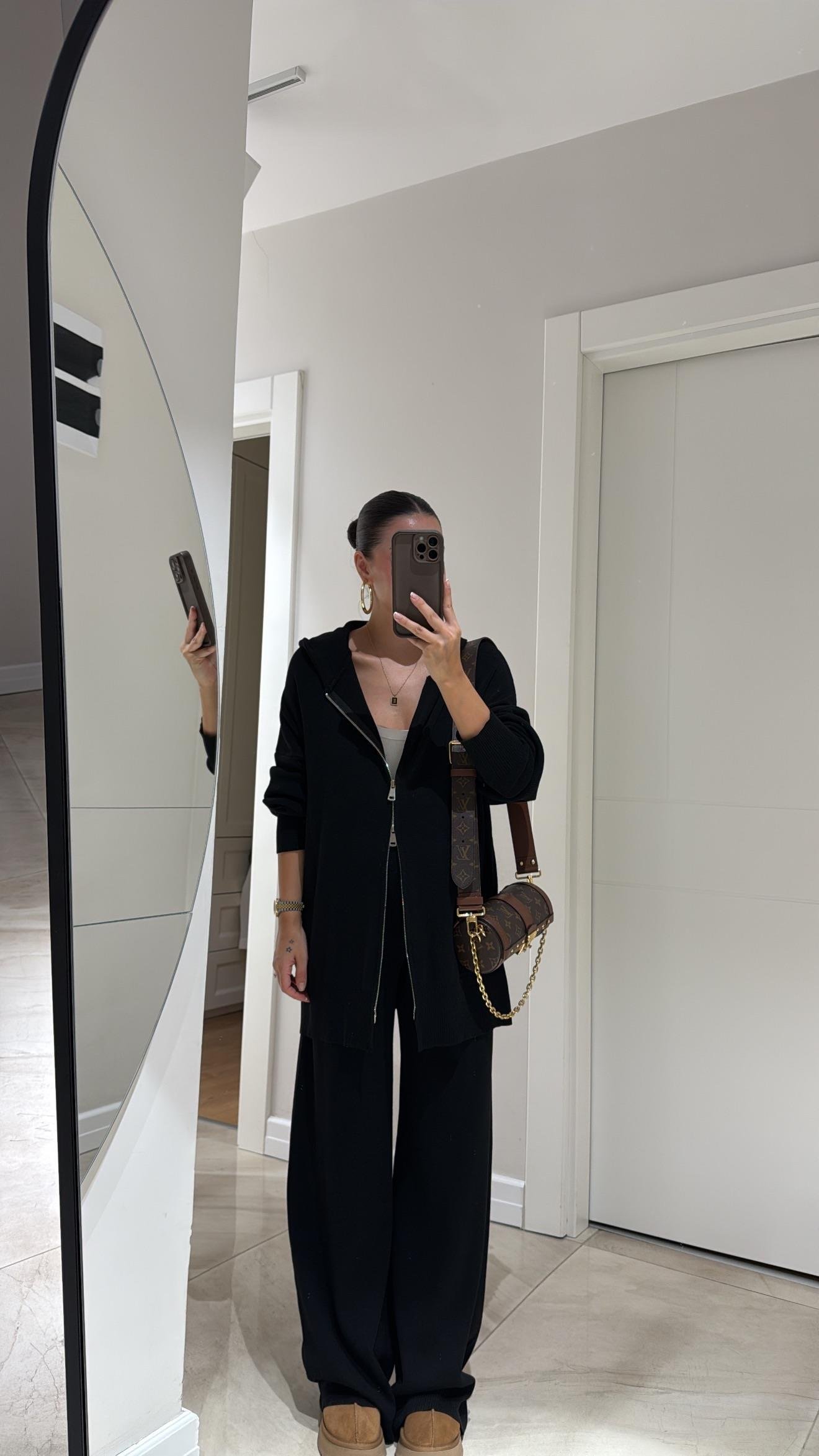 Siyah Çift Fermuarlı Kapüşonlu Triko Pantolon Takım
