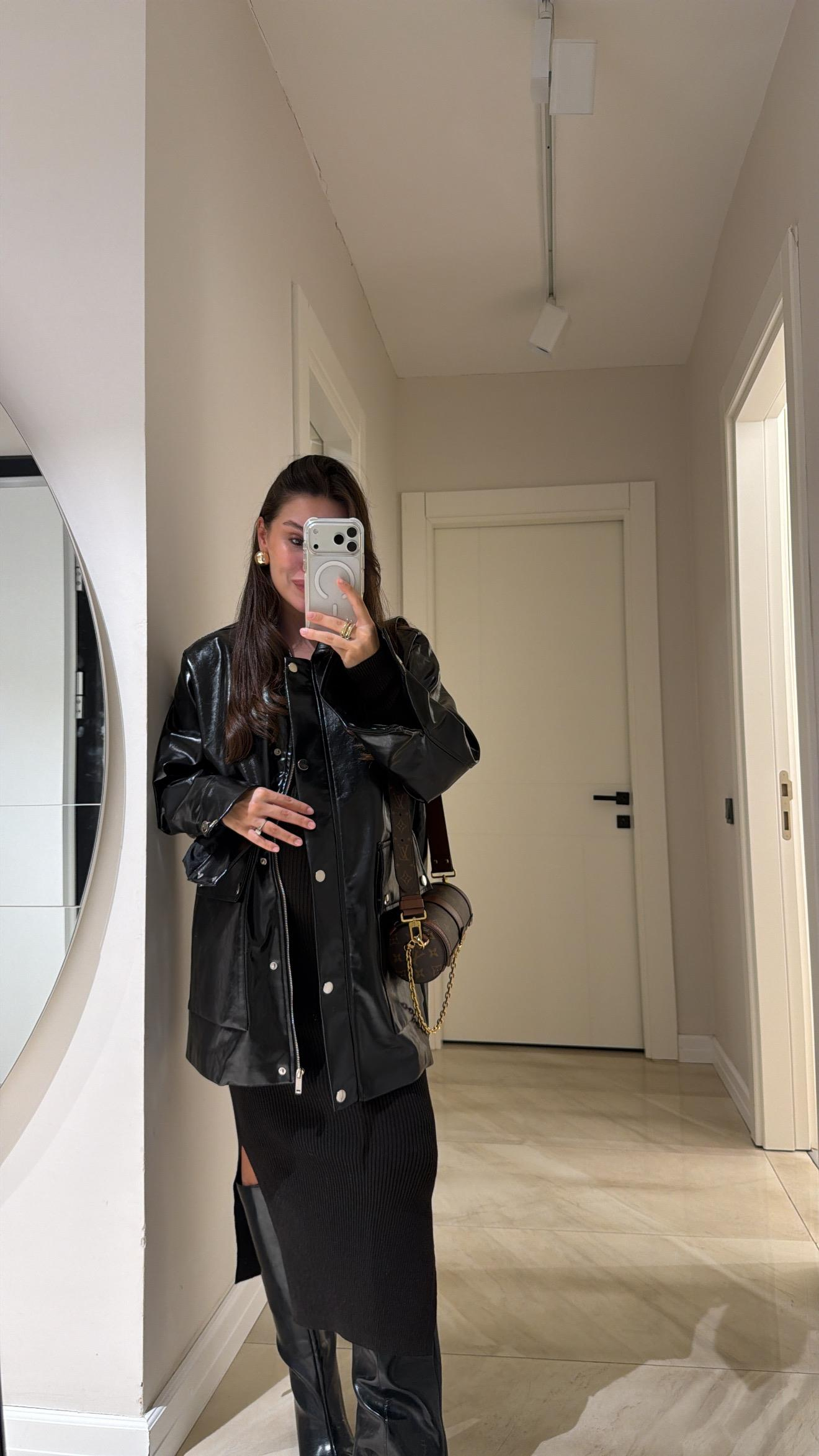 Siyah Geniş Cepli Parlak Deri Ceket (Bckt586)